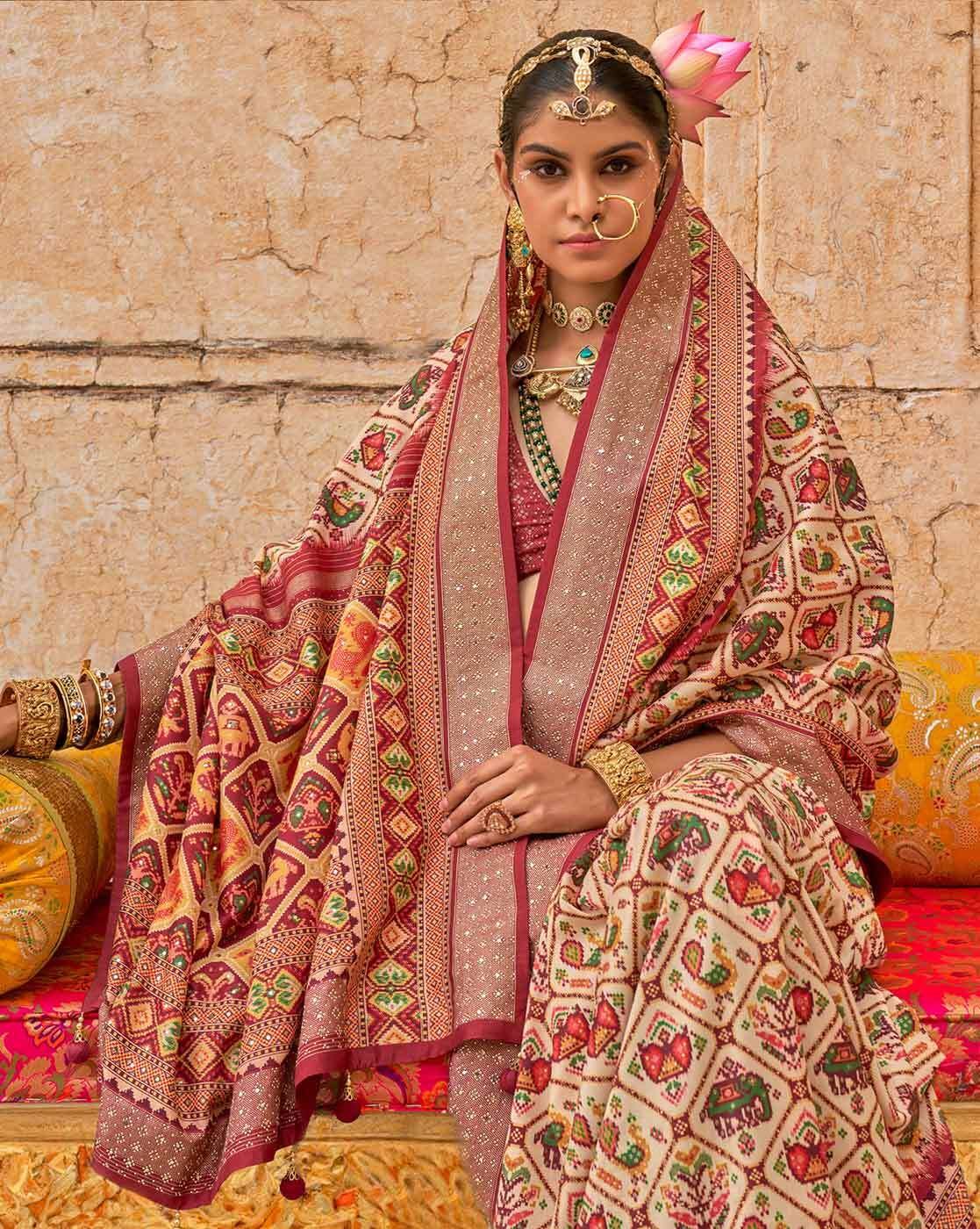 • Print & Pattern :- Ikat, Work Deatils :- Tassels and Latkans, Occasion :- Traditional/Festive, Type :- Patola