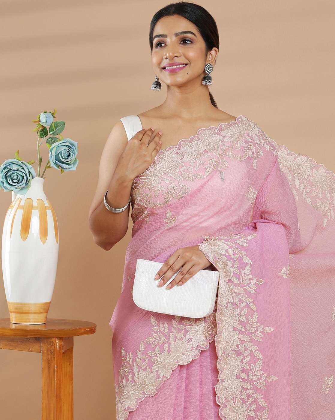 - Full Of Flamingo Pink Color Crushed Organza Saree With Cream Color Thread Work Design On Body And Thick Worked Pallu With Scalloped border And Same Work Blouse